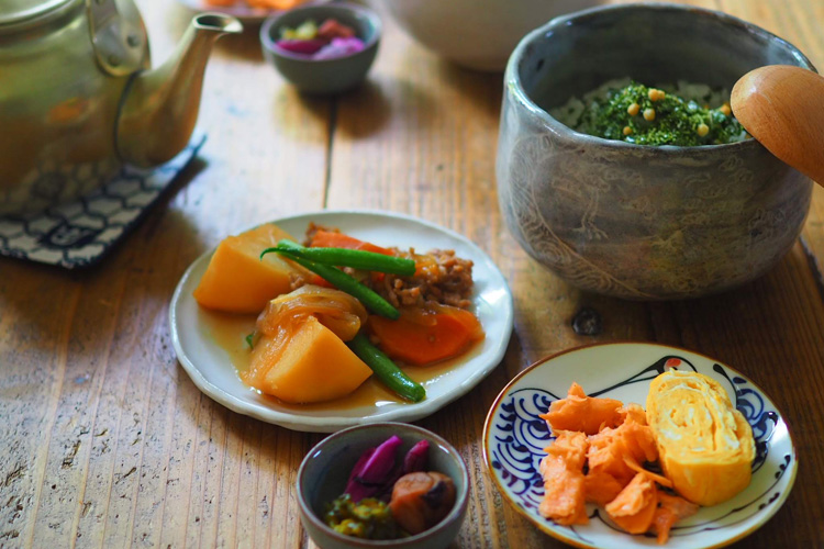 - 鮭が焼けたら食べやすくほぐし、漬物も食べやすく刻んでおく