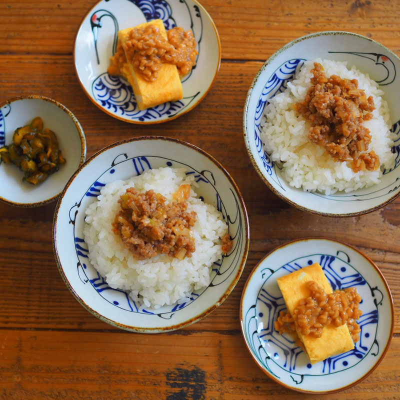 - 茶漬けの素、鮭、漬物を載せ、お茶漬けにしていただく