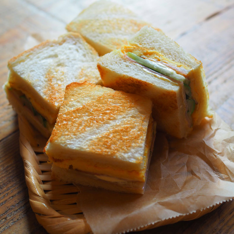ちょっとレトロな喫茶店で出て来そうなシンプルホットサンド。卵、ハム、きゅうりと王道の材料ながら深い味です。パン耳は好みで切り落としても。