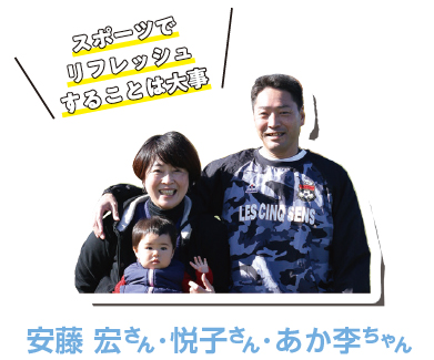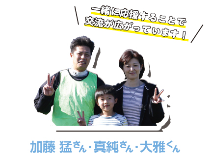 チームメイトの方に支えられて、主人も楽しくプレーしているように感じています。家族も一緒に応援しながら、交流をもたせていただき、友達の輪も広がっています。大会があると家族のお出かけにもなるので、ありがたいですね。