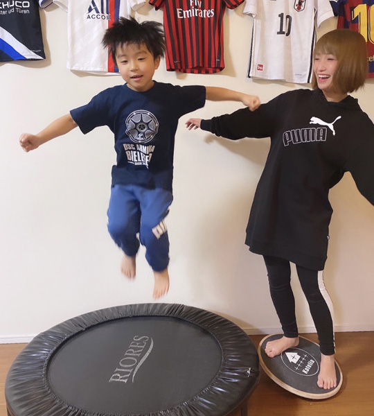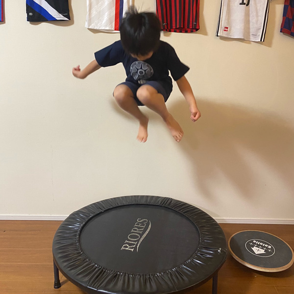 トランポリンやバランスボード、フォームローラー、ヨガマットなどを使用したおうち体幹トレーニング。実行しているサッカーキッズも多いと思います。