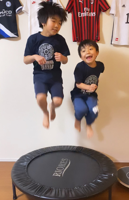 例えばバランスボードは、1人でやらせるのではなく、自分も一緒にやって見て、どちらが先に1分クリア出来るか?とか、トランポリンは誰が一番高く飛べるか、ヨガマットとサッカーボールを使ってその姿勢を何秒保てるか・・・などなど。