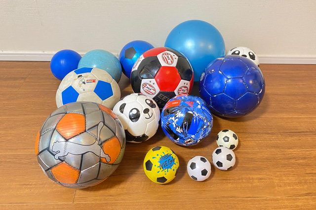 ただ、子ども達が一番過ごす時間の多いリビングに大小様々なボールを転がして置くと、自然とボールを足で転がしています