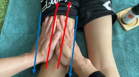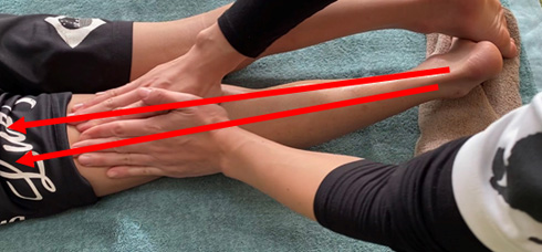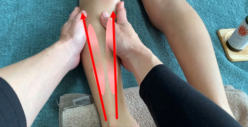 足首から足の付け根に向けて、オイルを塗布してあげます。オイルを使うことで、皮膚への摩擦を防ぎ筋肉にアプローチしやすくなります。