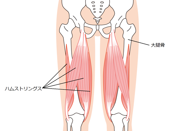 ハムストリングスは、ひざ下から坐骨や太ももの骨(大腿骨)に付いています。ハムストリングスは3つの筋肉の総称で、とても広い範囲に筋肉があるため、もも裏全体を広く触るイメージで「行きは上~、帰りは横~」と唱えてさすります。行きは下から上に向かって、もも裏の真上をぐ~っとさすり、帰りは上から下にももの両側面をぴっぱってくる感じです。