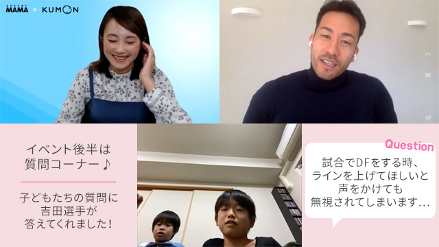 そして、イベント後半の質問コーナーでは指名された参加者が吉田選手に直接質問! 憧れの選手からアドバイスをもらえるとあって、吉田選手の言葉を真剣に聞き入る子どもたち。吉田選手も子どもたちの質問にユーモアを交えつつ回答してくれ、和気あいあいとした時間となりました。