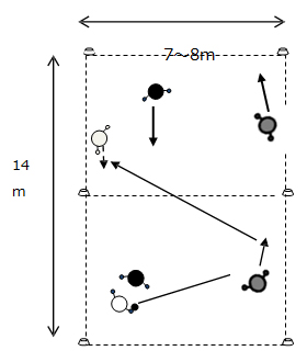 2人1組で動くため、同じ色のビブスの選手がボールを取られた(取った)ら、攻撃者(守備者)2人とも攻守を交代する。