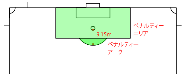 ペナルティーエリアやペナルティーアークのラインは全てエリアに含まれていますので、ラインも踏んではいけません。