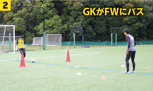 ❷GKはコントロールしてFWにパス