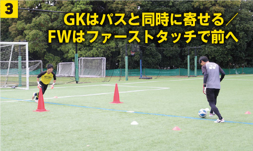 ❸GKはパスと同時に間合いを詰めるため、FWに寄せていく/FWはファーストタッチでシュートエリアに入りシュート。赤コーンの間のゴールを狙う。