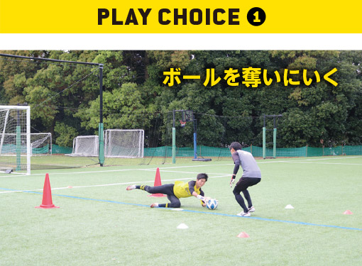 今回はGKが相手FWの間合いに入れている設定を紹介。FWはペナルティーエリア内に侵入後、GKに寄せられ、選択肢が限られている状況になる。GKは間合いを詰め、FWの選択肢を奪うイメージで取り組んでほしい。1vsGKにおけるプレーの優先順位は、ボールを奪うこと。まずはそれを狙いつつ、2種類のブロックを選択。とっさの判断のなかでも、確実に技術を発揮することで、実践にも活かせるようになる。判断の質やフォームにもこだわってみよう。