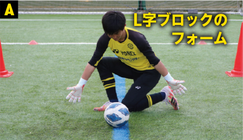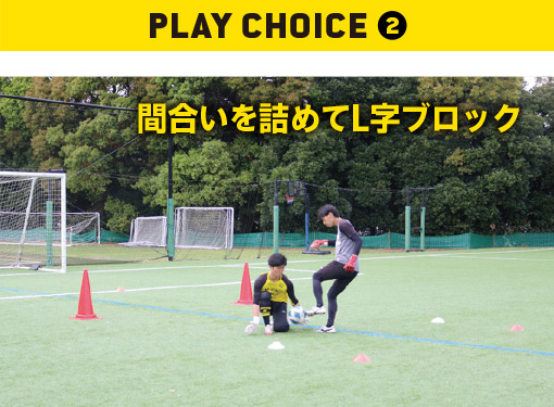 ❷FWのほうがボールに近いものの、足元まで間合いを詰められたときに選択するのがL字ブロック。この形でシュートコースをふさげる間合いまで寄せられていれば、片膝しか地面に着いていないため、セカンドボールやドリブルにもスムーズに対応できる。