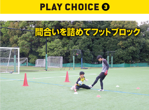 ❸ ❷までは間合いを詰められないものの、足を伸ばして体の面積を大きくすることでシュートコースをふさぐフットブロック。FWがシュートする足で、GKは足を伸ばす方向を決定。より大きく広い面積でシュートコースをふさごう。注意点は、飛び込みながら対応しないこと。勢いよく飛び込んでしまうと、一見、大きく見えていてもフォームが崩れ、シュートコースが空いてしまう可能性が高くなる。