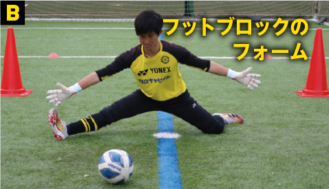 フットブロックは片脚を伸ばし、お尻を地面に近づけて股下のコースをふさぐ。伸ばした脚のつま先は真上に向ける。ボールが当たった際、ゴール方向に行かないように防ぐのと、ケガ防止にもなるため重要である。