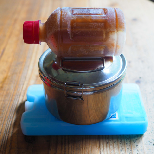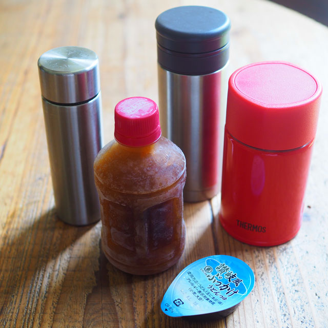 つゆを入れるものは小さいスープジャー、ミニ水筒でも便利ですし、保冷剤代わりもなるので凍らせて持っていくのもおすすめです。今は1人分のつゆも売っているので、状況によって使い分けするのも良いですね。うちのミニ水筒は160mlです。