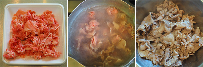 - オクラから3分ほどゆで、取り出したら豚しゃぶをゆでる。