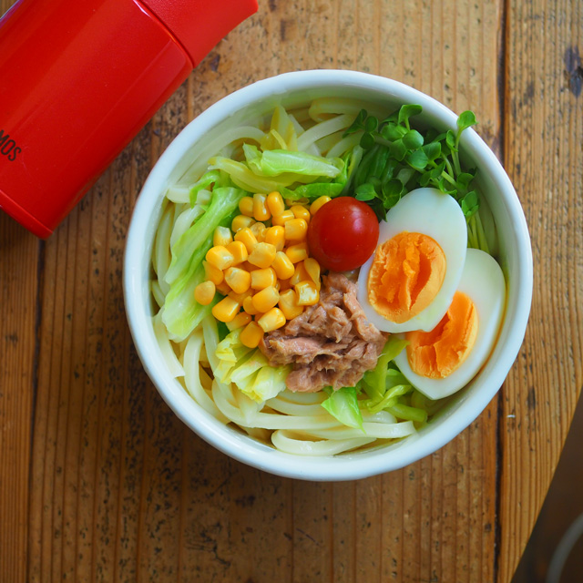 トッピングをツナやコーンに変えて、茹で卵をトッピングするだけでまた違うサラダうどんができます。