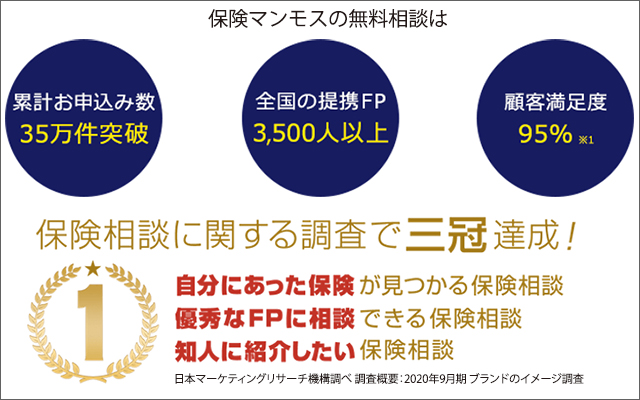 なお、「保険マンモス」は、優秀なFPに相談できる保険相談ナンバー1(保険相談に関する調査の3カテゴリでトップの評価)に選ばれ、提携FPの取り扱い保険会社数は平均22社。