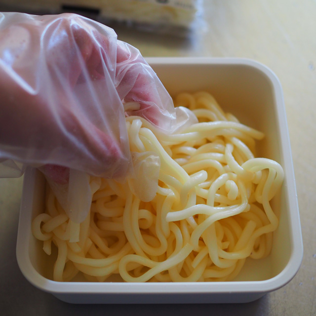 1. うどんをコツのやり方で容器にいれ具材をのせていく。