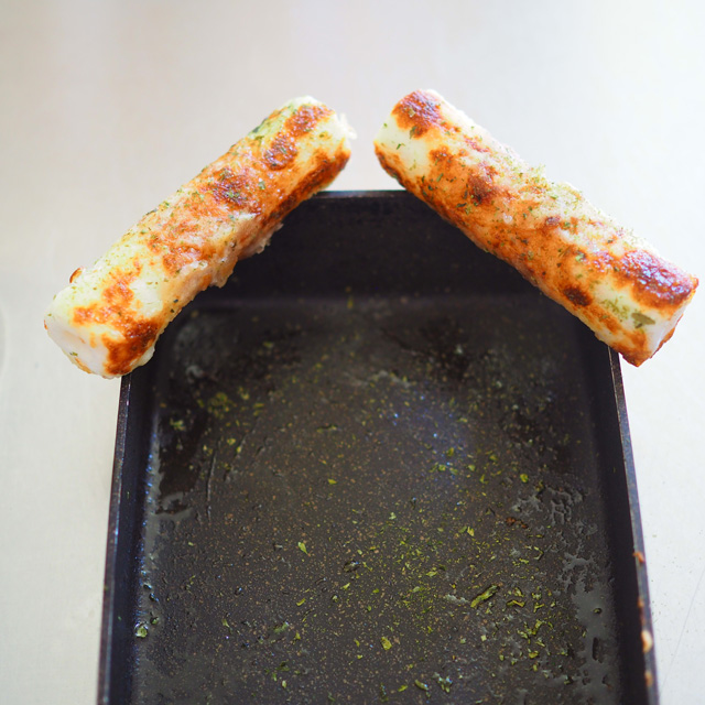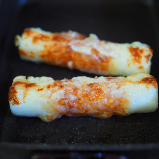 竹輪の磯辺揚げは磯辺焼きにします。かなり少ない油でじっくり全面焼くだけですが、ちゃんと天ぷらになります。衣も適当で全然大丈夫です。
