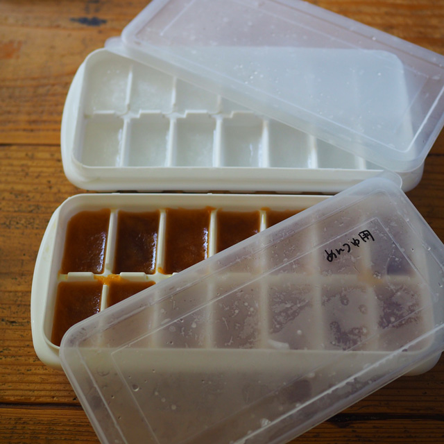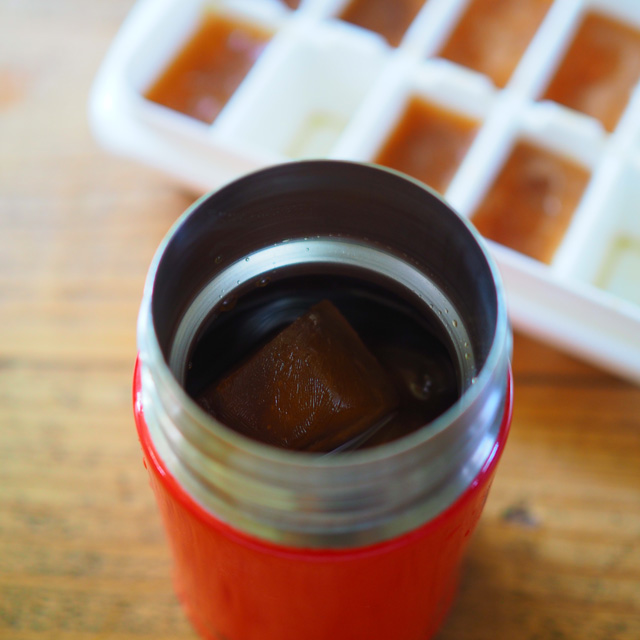 そこで、水筒やジャーを使う時には、麺つゆと一緒に製氷皿で凍らせた麺つゆを数個入れます。これなら氷が溶けて麺つゆが薄くなる心配もありません。