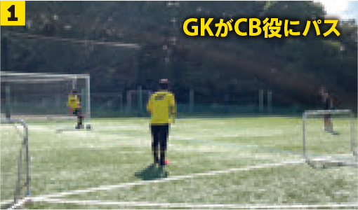 ❶ゴールキックの位置からGKはCB役にパス/相手FW役の選手はミニゴールの間で待機。