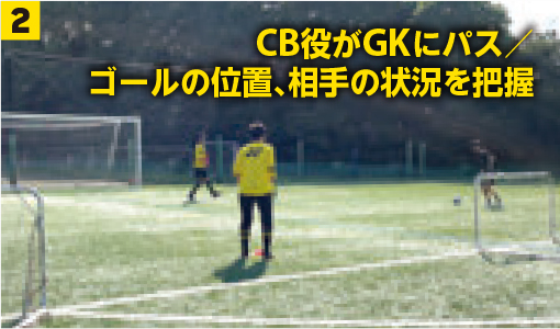 ❷CB役からGKがパスを受ける/相手FW役は自由に動ける。