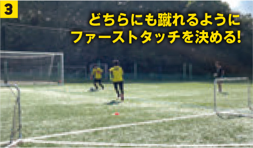ポイントは2つ。1つ目はパスを受ける前に逆の状況を把握すること。相手FW役がプレッシャーに来そうなのかなどを把握し、サポート位置を決定する。パスコースがなくならないポジションを取ることも重要。2つ目はファーストタッチのボールの置きどころ。2タッチ目で2つのゴールどちらにも蹴れる位置に置くことを意識する。