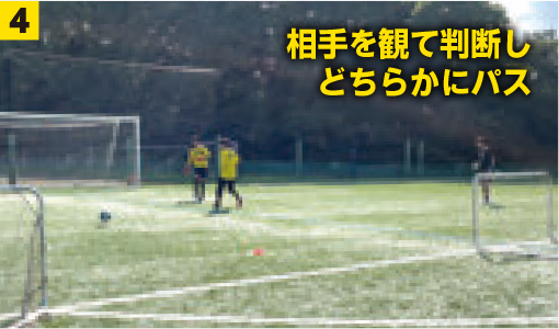 ❸❹2つのミニゴールをCB、ボランチに見立ててGKはパスを出す。