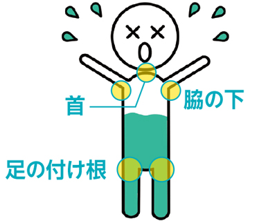 冷やす場所は、首、脇の下、足の付け根です。この3か所には大きい血管が通っているので、ここを冷やすことで効率よく体温を下げることができます。氷をしっかりあてることがポイントです。なお、明らかに症状が出ている際にはこの3か所に加えて、全身を冷やすような応急処置を。風通しをよくして、な るべく涼しい環境にするのも大事です。