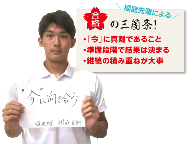 今はプロを目指していますが、大学では中学、高校と体育教師の免許を取得中で、将来は教員になることも考えています。大学受験を振り返ると、僕は筑波大の試験を受けるために特別なことをしていたわけではないんです。筋力測定も勉強も、いまその瞬間を一所懸命に積み重ねてきたことの結果であって、受験対策だけが目的ではなかったのです。高校生のみなさんも先に不安を感じることもあると思いますが、いまやるべきことを積み上げて頑張ってください。