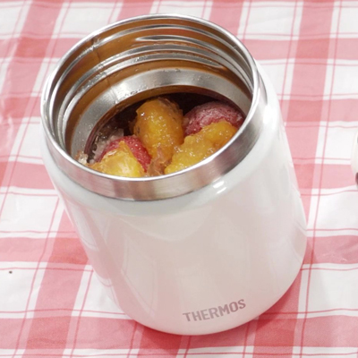 真空断熱スープジャーは保温だけでなく保冷もできるので、朝、下記の手順で材料を入れてフタをしておけば、食べる頃にはゼリーに!