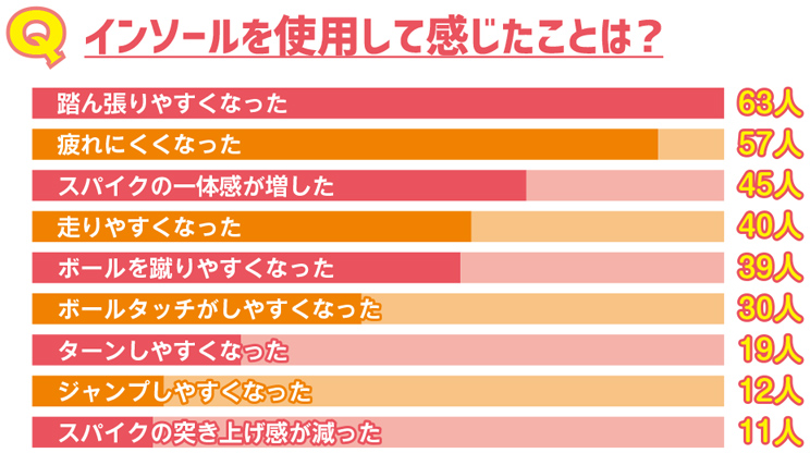 偏平足で足の疲労を感じていたのですが、インソールを入れると足の負担が減り、疲れも溜まりにくかったです。試合でブレーキをかけた時も、インソールのクッションのおかげで、膝への負担が減った気がします。