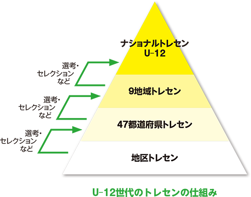 トレセンとは、JFAによるユース世代にむけた選手育成制度。U-12、U-14、U-16に分かれ、「個」を高めるトレーニングを目的とし、チームを編成して選抜大会に出場することも。所属チームから推薦された選手は地区トレセンの選考を受け、合格すると練習会などいくつかの段階を経て、都道府県トレセン、地域トレセンへと進み、ナショナルトレセンのメンバーに。なお、年代別日本代表の多くは、トレセンを経験した選手から選出されています。