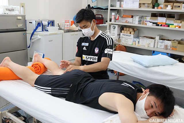「選手のテーピングなどのケアを中心に、練習中は選手に何かあった場合の現場対応をしています。JSCでは高校生、社会人と各カテゴリーの選手を担当してきましたが、プロではチームの一戦一戦の勝利に懸ける想い、重みが違います。食事・サプリメント・トレーニングメニューも選手自身が調べて実践し、それに対して質問されることもあるので、しっかりと答えられるように僕も視野を広げる必要があります。選手のプロ意識、取り組む姿勢に毎日刺激を受けながら、好調のチームの中でいい緊張感を持って仕事ができていると思います」