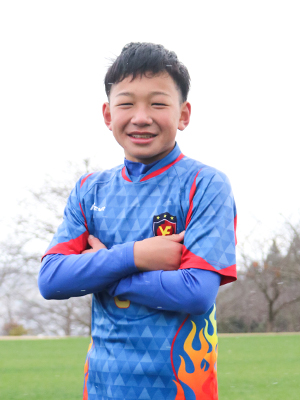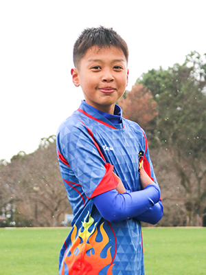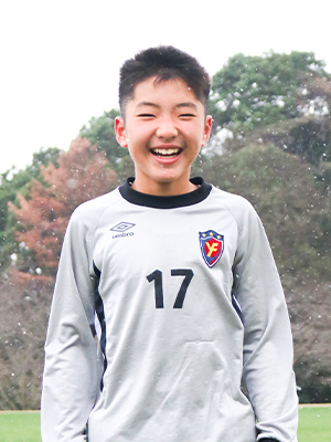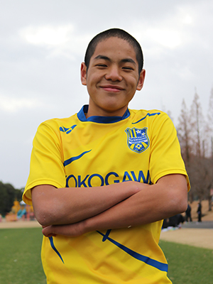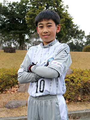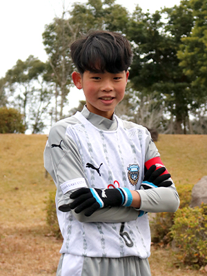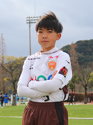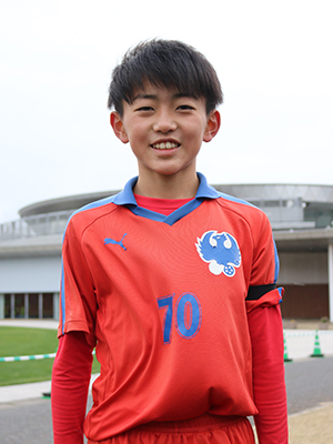 「ディフェンスラインからロングキックを蹴れることがストロングポイントだと思っています。強すぎないように、弱すぎないように、狙ったところに早く通せるように意識しています。身体を大きくするために、毎日牛乳を1リットル飲むようにしています。夜ご飯を沢山たべて、睡眠も多くとるようにしています。全国は球際も強いし、個々の能力が高くて上手いので、体格を生かして抑えていきたいです。僕はベガルタに入ったときは一番下手だったんですけど、毎日練習で努力してキックの精度を上げてきて、6年生の今、この場所に立てることが何よりうれしいです。毎日の送り迎えと、栄養たくさんの食事をいつも用意してくれる母に感謝したいです。将来は日本代表になってW杯で優勝したいです!」