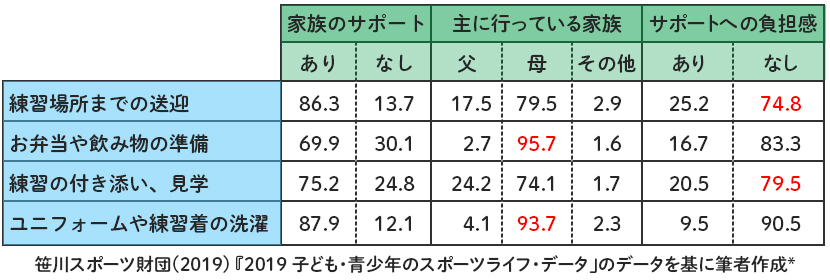 また、このデータからわかるもっとも興味深いことは、「サポートへの負担感」が示す「負担感のなさ」です。例えば、送迎や付き添いは、負担感あり(およそ20%)に対して負担感なし(およそ75%)です。さらに、お弁当などの準備(80%)、洗濯(90%)が「サポートの負担感」に「なし」と回答しています。多くの保護者(その担い手の多くは母親です)は、子どものスポーツ活動に対して、様々なサポートを担っているにもかかわらず、その役割を負担と感じていないことがわかってきました。
