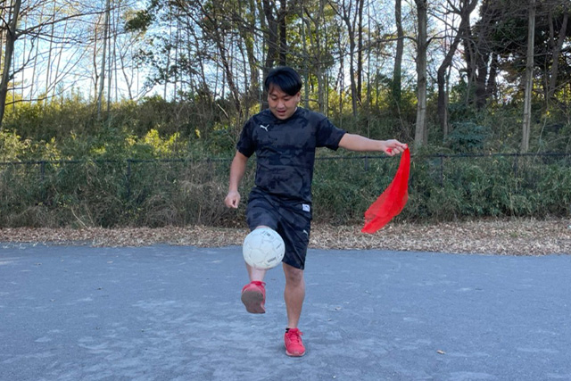 ワンバウンドリフティングを行いながらタオルを振ってみましょう。リフティングが得意な選手はノーバウンドにも挑戦してみてください!