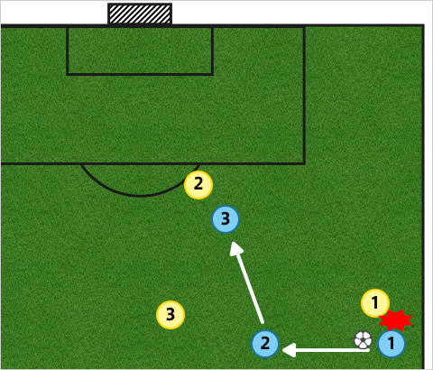 タッチライン際でワンツーによって抜け出そうとした攻撃側選手❶が攻撃側選手❷にパスを出したとき、守備側選手❶によってトリッピングの反則を受けて倒れた。しかし、横にいた攻撃側選手❷がワンタッチで前方にいた攻撃側選手❸の方向にパスを出した。