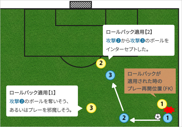 しかし、攻撃側選手❸がプレーした後、守備側選手❷にボールを奪われても、あるいはシュートを外しても、ロールバックはしません。また、ラグビーのようにかなりの時間プレーさせてからロールバックするというようなことはできません。