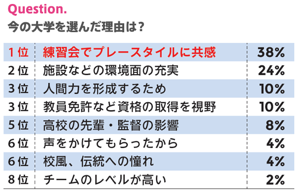 直属の先輩など身近な人が進学しており、その後も活躍しているから、という理由をあげている選手も。自分がよく知る人物がいると部の話も聞きやすいですし、自分が入部した際のイメージも湧きやすいのかもしれません。