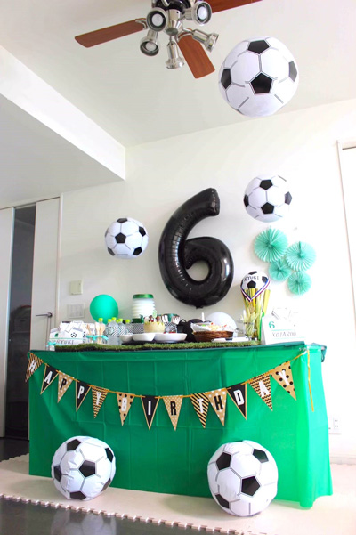 息子が幼稚園に通っていた6歳の誕生日パーティーは、いつもは蹴ってばかりのサッカーボールを宙に浮かせてデコレーション。100円ショップで購入したサッカーのビーチボールが宙に浮いているだけで非日常空間が出来上がり、息子も大喜びでした。パーティーにご招待したサッカー少年やサカママ達にも大好評で、ボールはパーティーが終わった後にサンクスギフトとしてプレゼントしました。