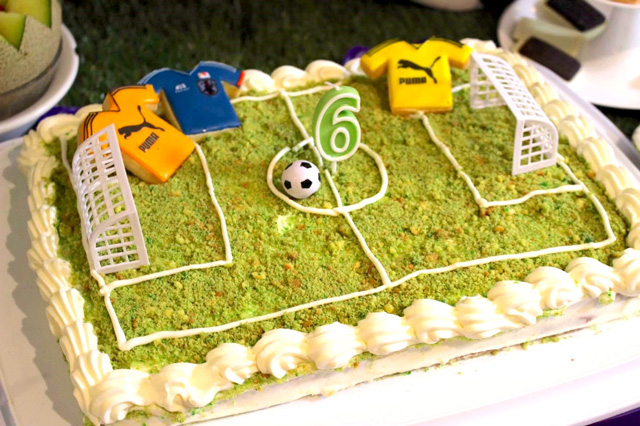 スイーツ作りが得意な友人にサッカーコートをイメージした大きなケーキを作っていただいたり…
