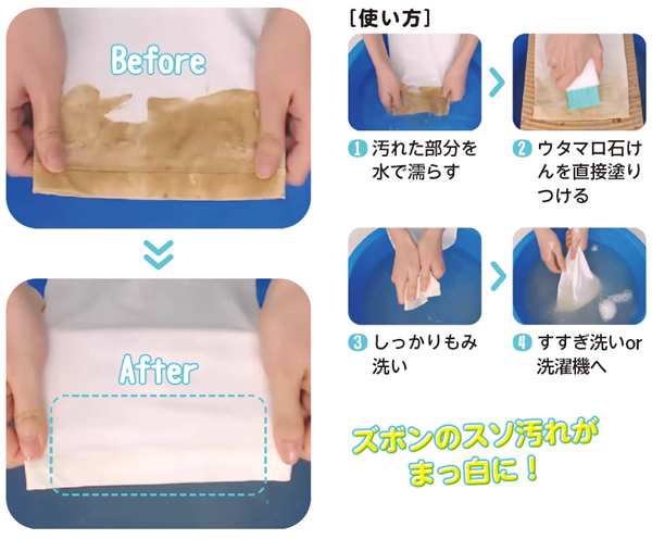 ※ウタマロ石けんは、蛍光増白剤を配合しているので、「無蛍光洗剤使用」という表記があったり、生成りやベージュがかった衣類に使ってしまうと、蛍光増白剤がムラづきしてしまうことも。その場合は中性・無けい光のウタマロリキッドをお使いください。 - ウタマロ石けんの緑色が消えるまでしっかりともみ洗い