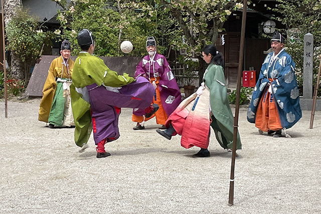蹴鞠のルールは、1チーム8人がひとグループになり、鞠庭と呼ばれる場所で鞠を落とさないように蹴り合いその回数を競うというものです。ルールはとてもシンプルですが、蹴鞠には幾つもの作法があるそうです。もちろん使うのは空気のしっかり入ったボールではなく、空洞に近い球(鞠)です。着物で独特な靴を履いて蹴る様子を見ると、サッカーのリフティングよりも難しいことが容易に想像できました。