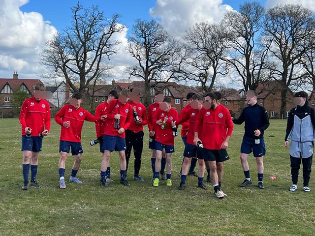 今シーズン、長男の所属するチームは地域1部リーグで優勝したのですが……リーグ最終戦、ホイッスルが鳴った瞬間まさかのシャンパンファイトが始まってびっくり!! その日の気温は3度(4月上旬です)、まだ朝の10時半……日本人の私からするとシャンパンファイトをする条件では全くないのですが、イギリス人にとってそんなことは関係なしです。私もちゃっかり朝っぱらからシャンパンをいただきました(笑)。