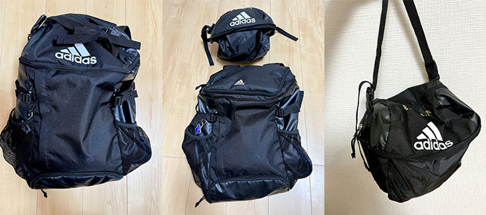 このような条件で息⼦と私が選んだバッグが、「アディダス4号球専⽤ボールバッグパック」でした。決め手は、上部のボール⼊れ箇所が取り外し可能で、公園にちょっと練習へ行く時などはボールバッグにして使えるところ。トランスフォームする3wayスタイルが⼩学⽣男⼦の⼼をゆさぶりました。笑
