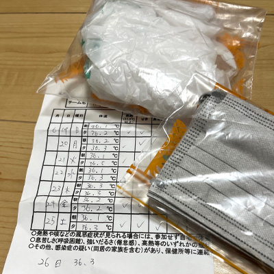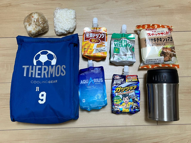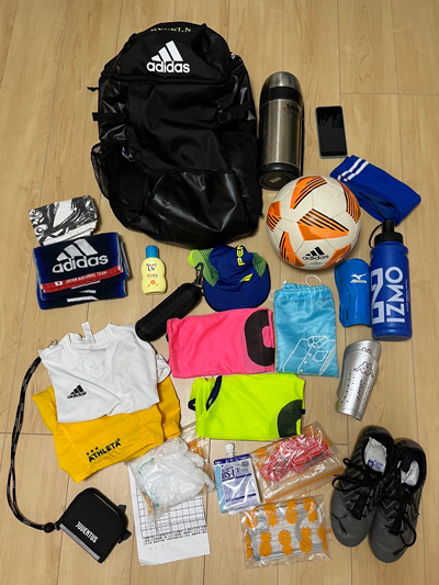 サッカーシューズ(中に湿気取り)、レガース2セット、サッカーボール、着替え1セット、ビブス2枚、タオル2枚、帽⼦、⽇焼け⽌め、⽔筒2本、財布、スマホ、メガネケース、経⼝補⽔液OS-1、都こんぶ、マスク、検温表、ゴミ袋、ゴミ