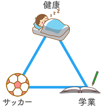 この三角形は、健康・学業・サッカーの3つで成り立っています。健康な体があって、学校のこと(学業・学校生活など)がきちんと出来、サッカーをやる。どれかが疎かになると三角形がいびつになってしまう。なので、この先もこの三角形が綺麗な形を保てるようにしていこう!と話をしました。