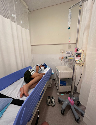 まだ元気はないけどご飯も食べたし、これで明日の合宿は大丈夫かなと思っていたのですが……夜中に突然の高熱。測ってみると38度。コロナなのか熱中症なのか分からずですが、熱以外のコロナの症状は無かったので、とにかく身体を冷やすようにしました。その後、明け方にかけて嘔吐も止まらなくなり、脱水症状が出ていた為、発熱外来に連絡。近くの総合病院の救急外来で診てもらうことになりました。